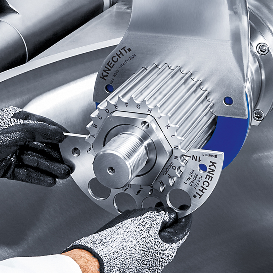Anstatt aufwendiger Halteringe konventioneller Messersysteme kommt beim KNECHT K 24 Kuttermessersystem eine Kombination aus verzahnter Profilhülse und einfacher Zwischenringe zum Einsatz. Oberste Priorität beim K 24 Kuttermessersystem sind einfachste Handhabung und maximale Betriebssicherheit. Daher wird komplett auf bewegliche Teile wie Bolzen oder Schrauben verzichtet.