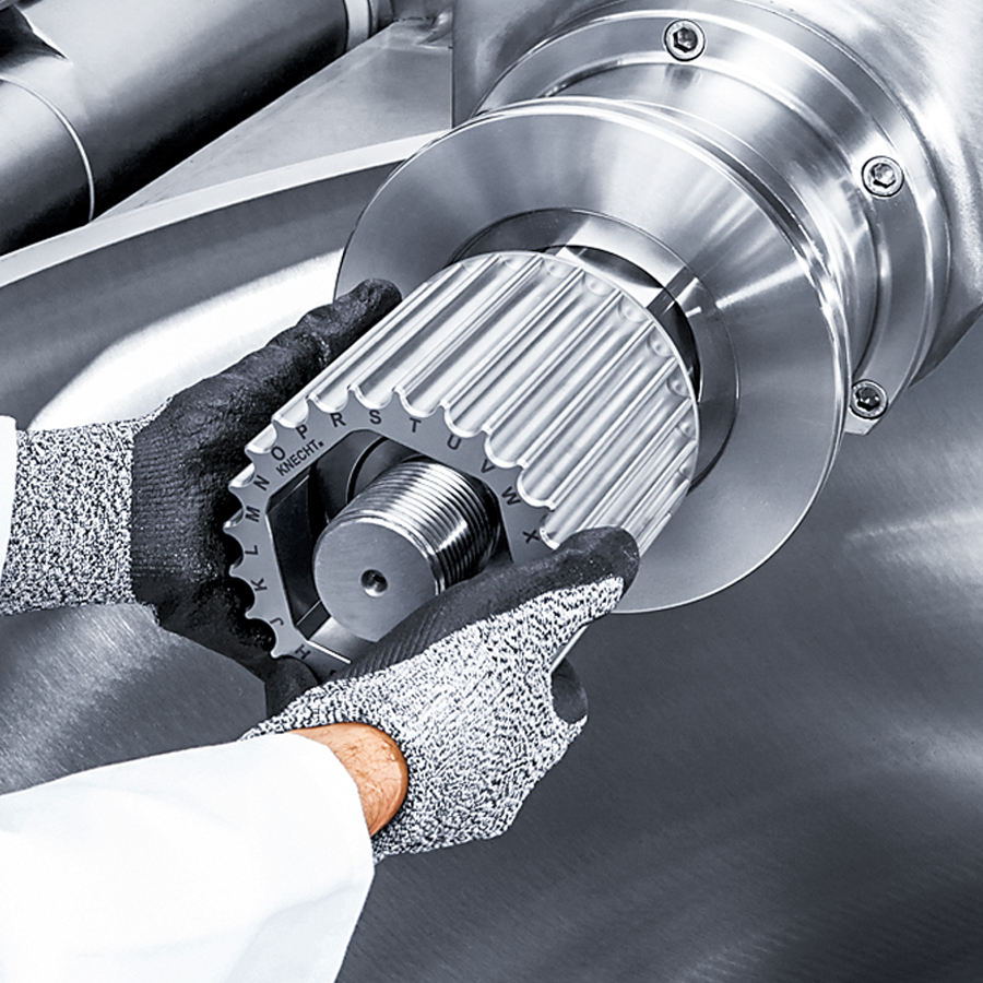 Die Spannmutter kompensiert Längenausdehnungen des Schneidsystems, verursacht durch Temperaturänderungen, z.B. bei Kochkuttern. Eine Verbiegung von Spannelementen durch zu große Spannkraft ist dadurch ausgeschlossen. Das erhöht die Bruchsicherheit des Schneidystems signifikant.