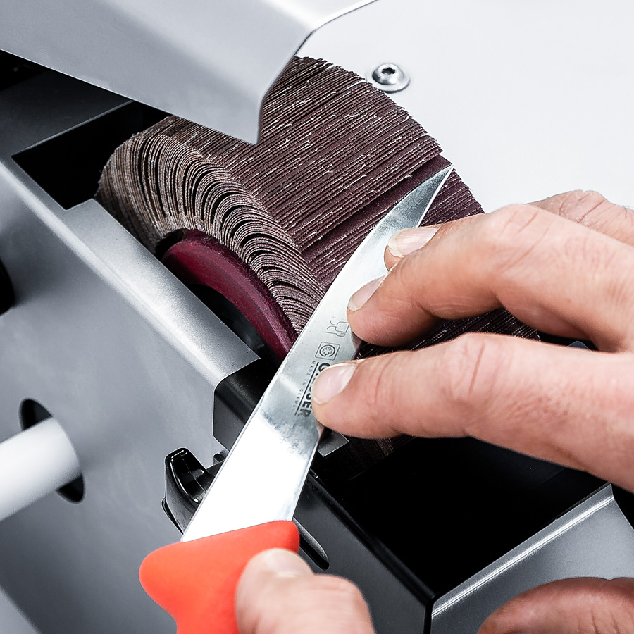 In der Version mit der HV 150 ist die Maschine speziell zum Nachschleifen von Handmessern ausgelegt.