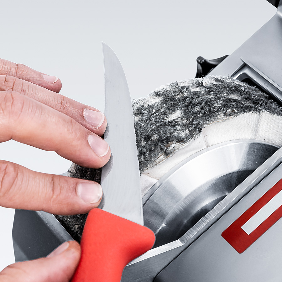 Die Messerführungen stellen sicher, dass die Handmesser immer mit dem richtigen Schneidenwinkel angeschliffen sind. Zusätzliche integrierte Magnete unterstützen die Führung des Messers und machen das Schleifen sehr einfach. Die langlebigen CBN-Schleifscheiben sind wassergekühlt.